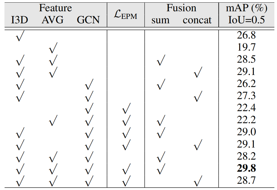 组件验证。表4显示了基于ACGNet中不同成分的结果。具体来说,我们测试了采用不同特征和不同特征组合方式时的性能。我们可以看到,将原始特征与加权平均或图卷积特征相结合可以显著提高整体精度。通过融合所有功能,我们可以获得最佳性能。同样值得注意的是,如果在图形训练期间丢弃EPM损失,则会观察到较差的性能。如前所述,这是因为图卷积层无法充分训练。有趣的是,当仅使用增强的基于图形的功能时,准确度会下降很多,这表明将其作为原始功能的补充是释放图形功能潜力的有效方法。此外,仅使用FAVG性能最差,因为整个视频的平均特征无法表示不同动作示例的不同时间动态。
