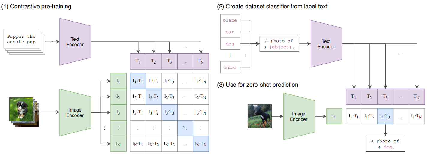CLIP主要完成的任务是:给定一幅图像,在32768个随机抽取的文本片段中,找到能匹配的那个文本。为了完成这个任务,CLIP这个模型需要学习识别图像中各种视觉概念,并将视觉概念将图片关联,也因此,CLIP可以用于几乎任意视觉人类任务。例如,一个数据集的任务为区分猫和狗,则CLIP模型预测图像更匹配文字描述“一张狗的照片”还是“一张猫的照片”。