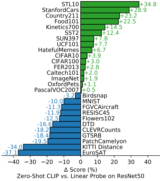 CLIP在各数据集上的zero-shot效果与ResNet50有监督效果对比(采用Linear Probe)