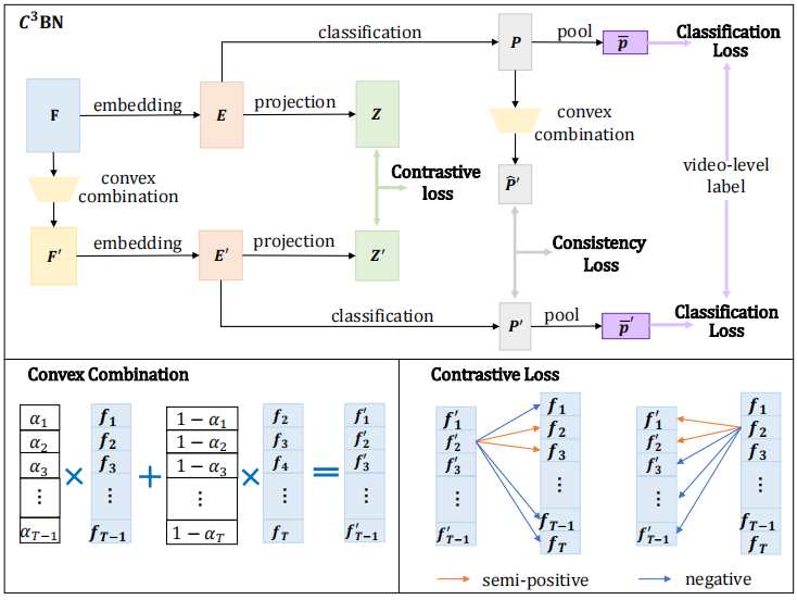 片段预测一致性:E按照MIL标准流程得到片段特征的logits分数S,通过softmax操作归一化S得到P,E'经过同样的操作得到P',在P上应用凸组合得到