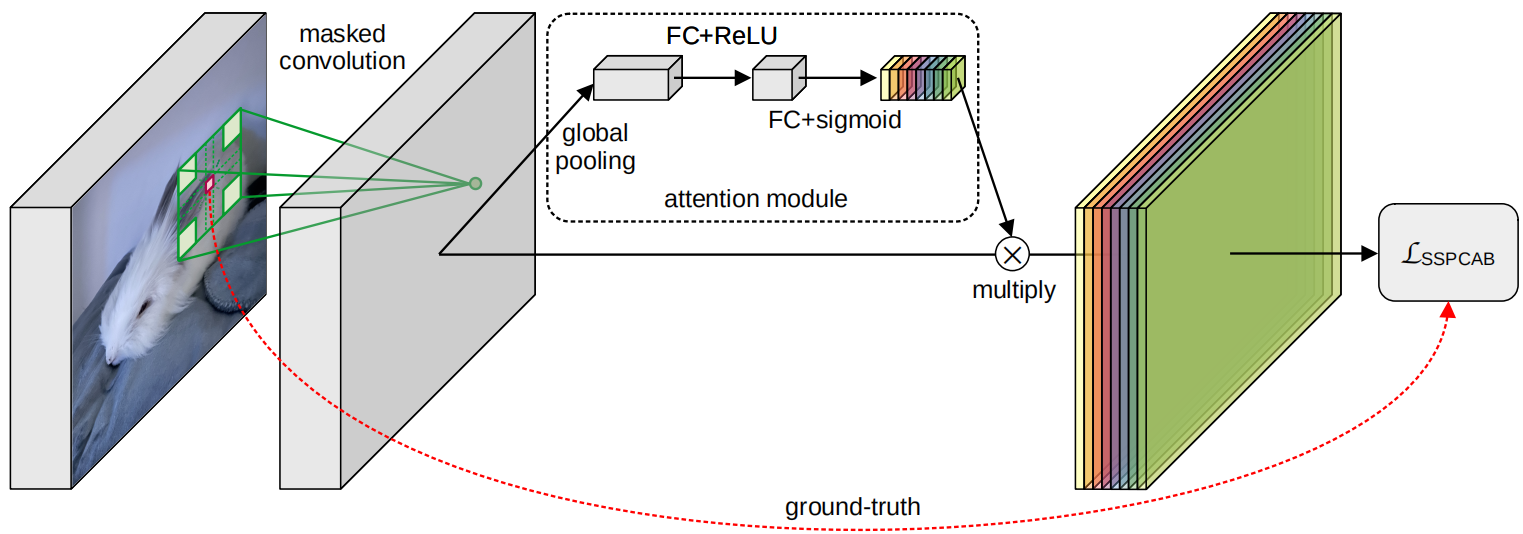 设计了一种基于掩码卷积和通道注意力的块结构来重建卷积感受野的掩码部分。在训练时,SSPCAB只学习正常例子的全局结构。当在推理时出现异常数据样本时,块可能会提供较差的重建。因此,可以测量重建的质量,并利用结果作为一种区分正常和异常例子的方法。