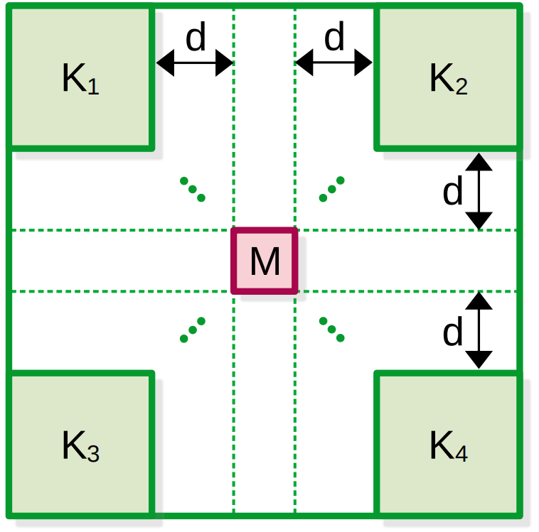 该卷积层带有膨胀掩码滤波器,可学习参数位于感受野的角落,由子内核Ki∈Rk'×k'×c,∀i∈{1,2,3,4}表示,k'∈N+是一个超参数,定义子内核大小,c是输入通道的数量。每个内核Ki位于距离感受野中心掩码区域d∈N+(膨胀率)的位置,掩码区域用M∈R1×1×c表示。因此,整个kernel大小为:k=2k'+2d'+1。