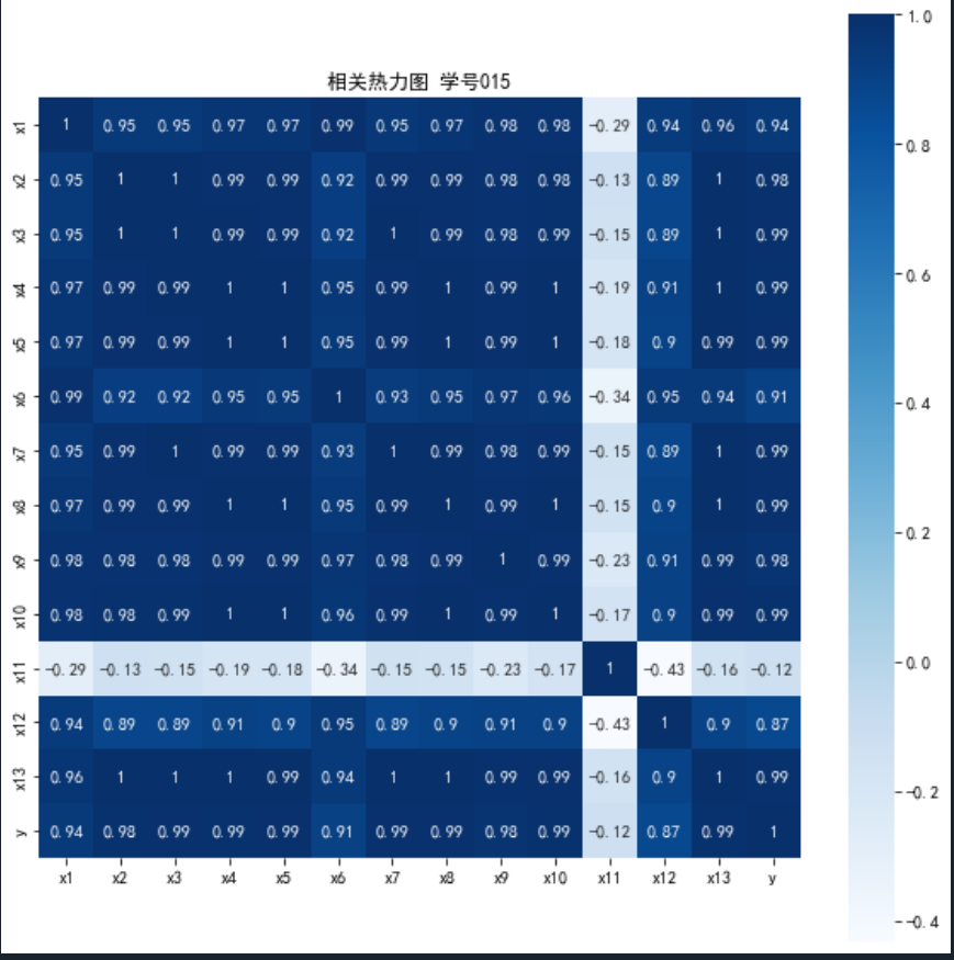 numpy as np import pandas as pd import matplotlib.pyplot as plt import seaborn as sns inputfile = 'C:/Users/just a player/Desktop/data.csv' #输入的数据文件 data = pd.read_csv(inputfile) #读取数据 #描述性统计分析 #依次计算最小值最大值均值标准差 description = [data.min(),data.max(),data.mean(),data.std()] #将结果存入数据框 description = pd.DataFrame(description,index = ['Min','Max','Mean','STD']).T print('描述统计结果:\n',np.round(description,2)) #保留两位小数 corr = data.corr(method='pearson') print('相关系数矩阵为:\n',np.round(corr,2)) plt.rcParams['font.sans-serif'] = ['SimHei'] # 用来正常显示中文标签 plt.rcParams['axes.unicode_minus'] = False # 用来正常显示负号 plt.subplots(figsize=(10,10)) sns.heatmap(corr,annot=True,vmax=1,square=True,cmap="Blues") plt.title('相关热力图 学号015') plt.show() plt.close