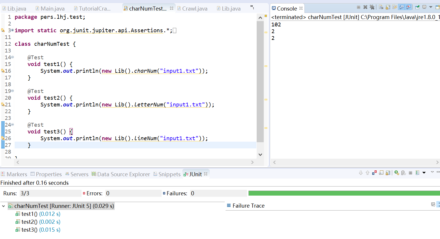 以上代码中charNum方法为Lib类中的方法,可以换成其他方法,用以测试Lib中的各个单元方法。