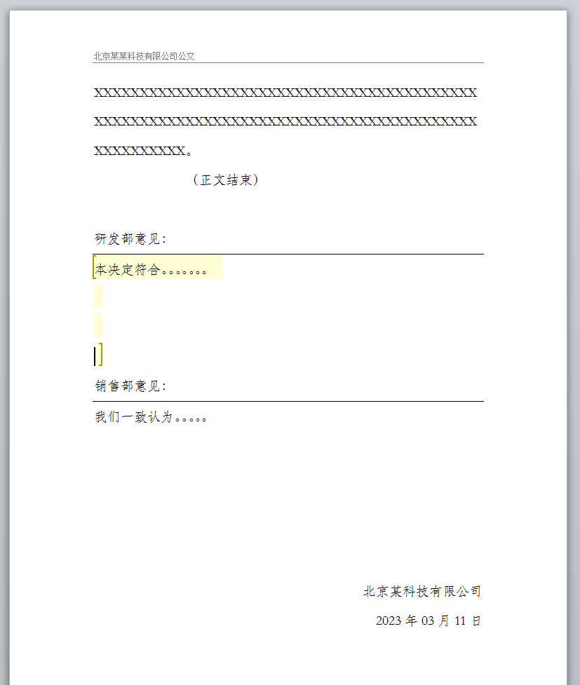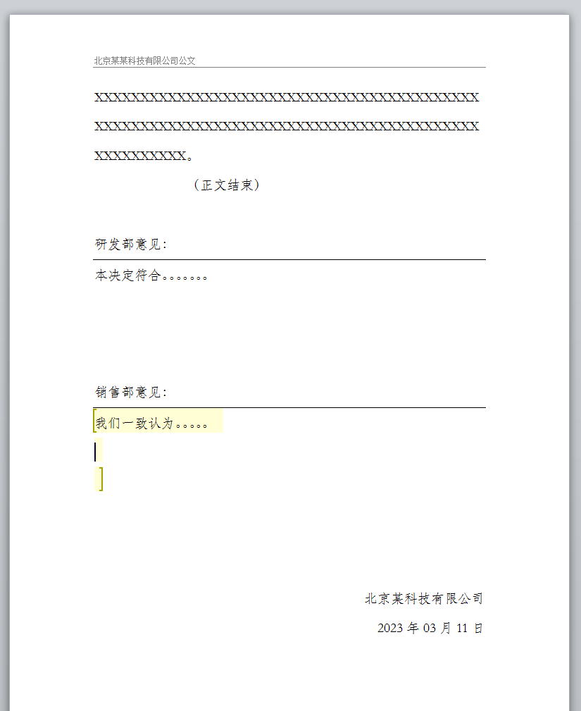 当B用户打开公文时只能编辑销售部意见的效果,如下图所示(只有黄色中括号内的区域可以编辑):
