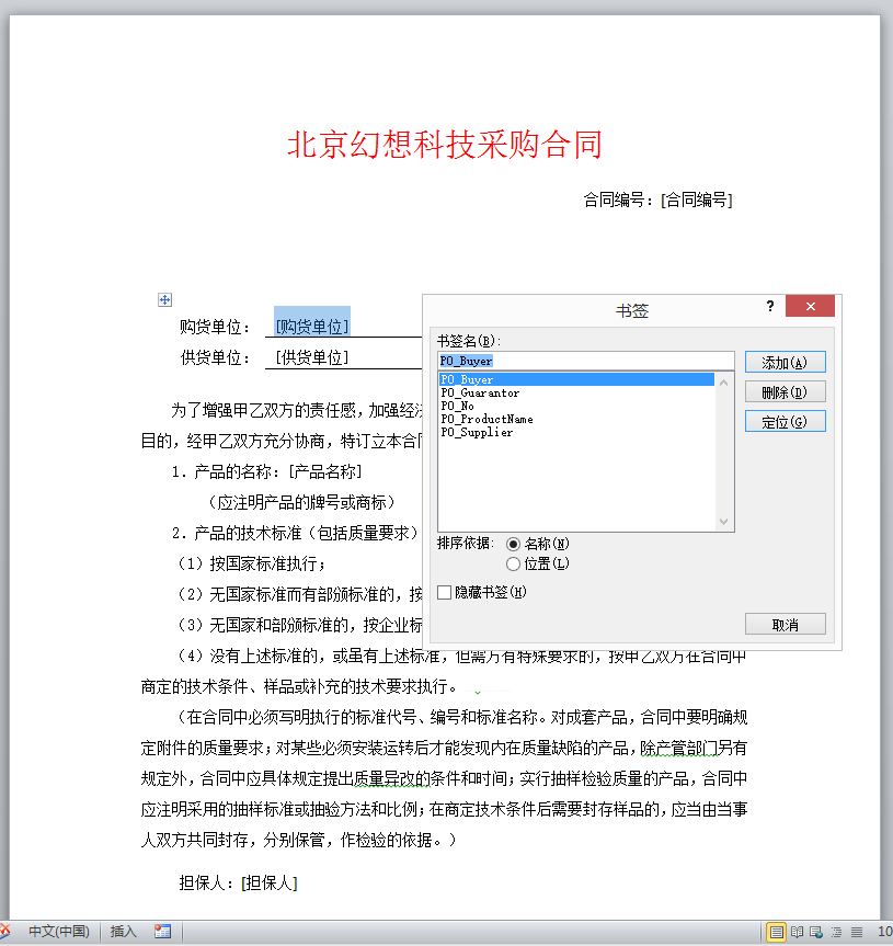 方法一:编辑Word模板,即在Word文档中添加书签。在D盘根目录下新建Word文件,比如:D:\template1.docx,打开文件用光标选中需要标记为书签的文字,比如“[公司名称]”,然后点Word菜单中的“插入”-“书签”,就会弹出一个标题为“书签”的对话框(如下图所示),输入新书签的名称,注意:书签名必须以“PO_”开头,并由字母和数字组成,但中间不能有空格。点右侧的“添加”按钮,新的书签名将出现在下面的列表中。此方法适用于,模板在项目开发时就固定下来不再修改的场景。