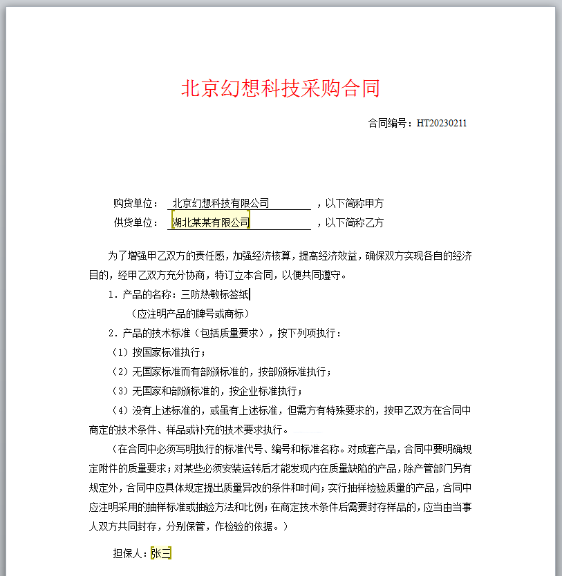 某公司要在线上起草采购合同,合同模板是固定的,合同条款几乎固定不变,只有签订合同的供货单位名称和担保人是根据实际情况变动的。因此,在线上制作合同时,只需要让合同中那些可变的区域可编辑,其他位置则不能编辑,这时就需要用到PageOffice的局部编辑功能。