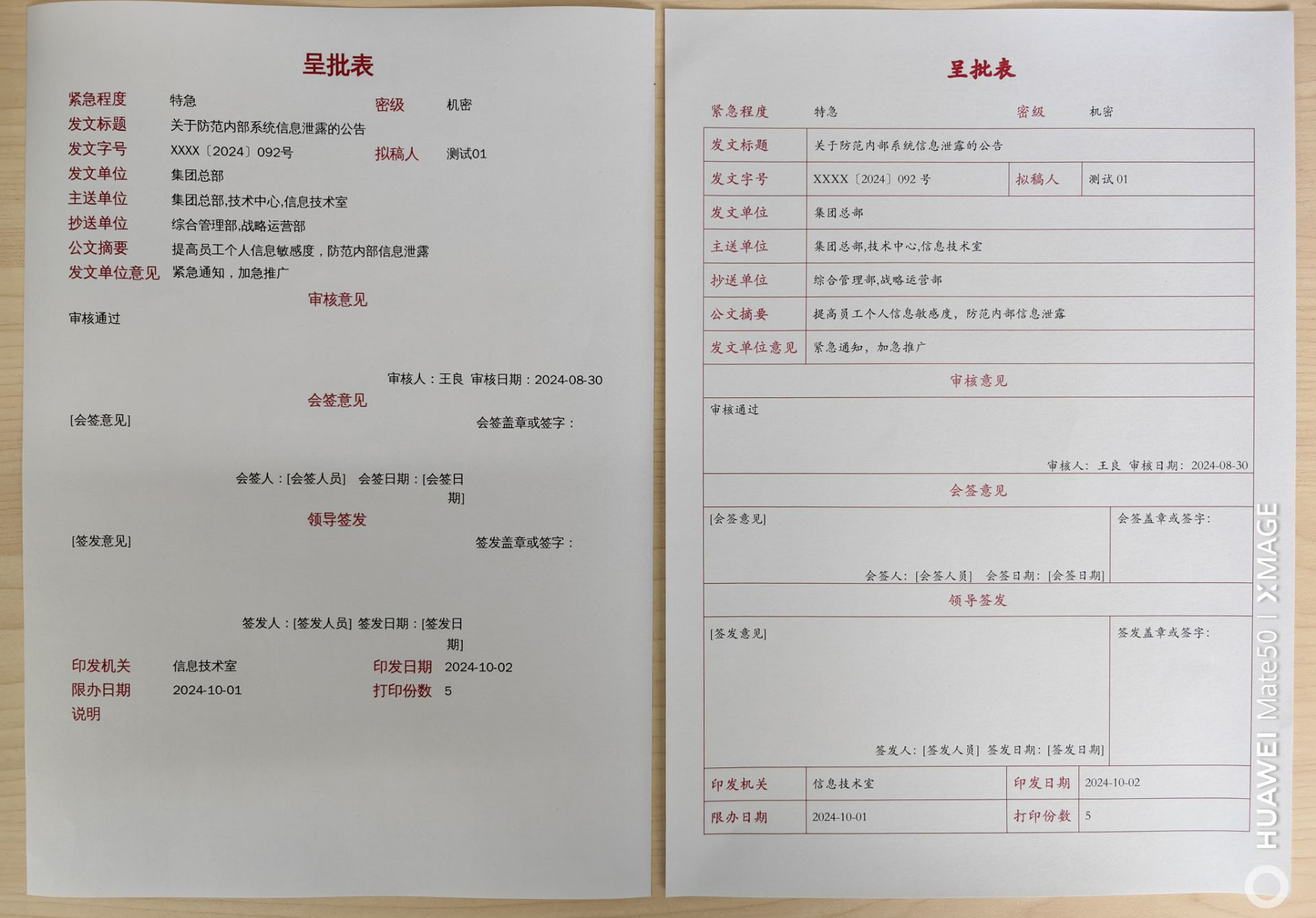 PageOffice的打印功能调用的是本地WPS或Word的打印,所以可以达到所见即所得的打印效果,保证了排版的一致性和打印效果的高质量。云文档在线打开的是Office转换的html格式的网页,对于Office文档来说,只要文档格式做了转换,就很难保证其内容中的排版、格式和样式等,更何况是转为html,所以就更加无法保证原Office文档的排版样式了。就上面的“呈批表”文件来说,使用PageOffice在线打印和云文档的打印(以OnlyOffice为例,其他云文档的效果大同小异)的结果对比,如下图所示: