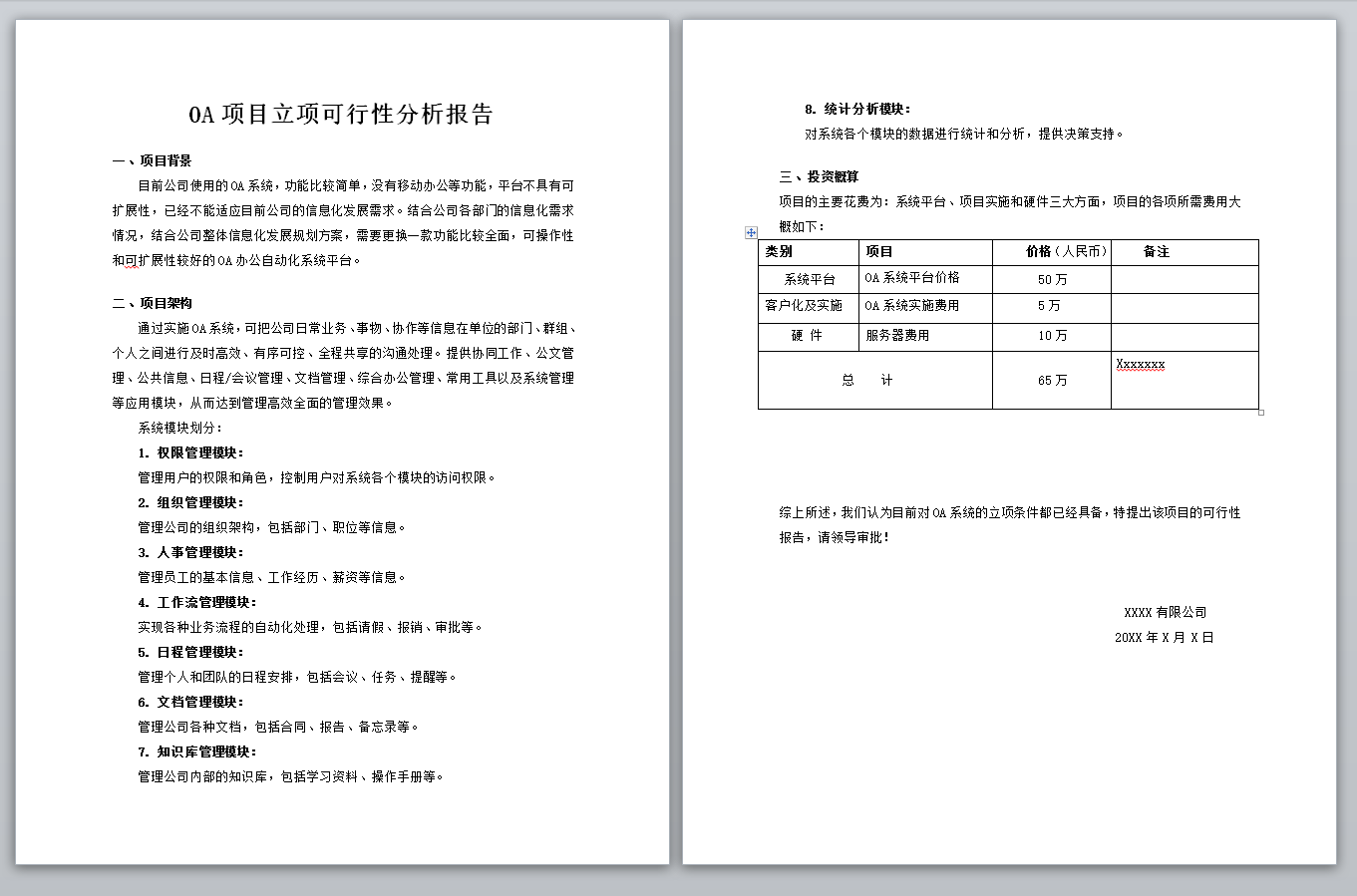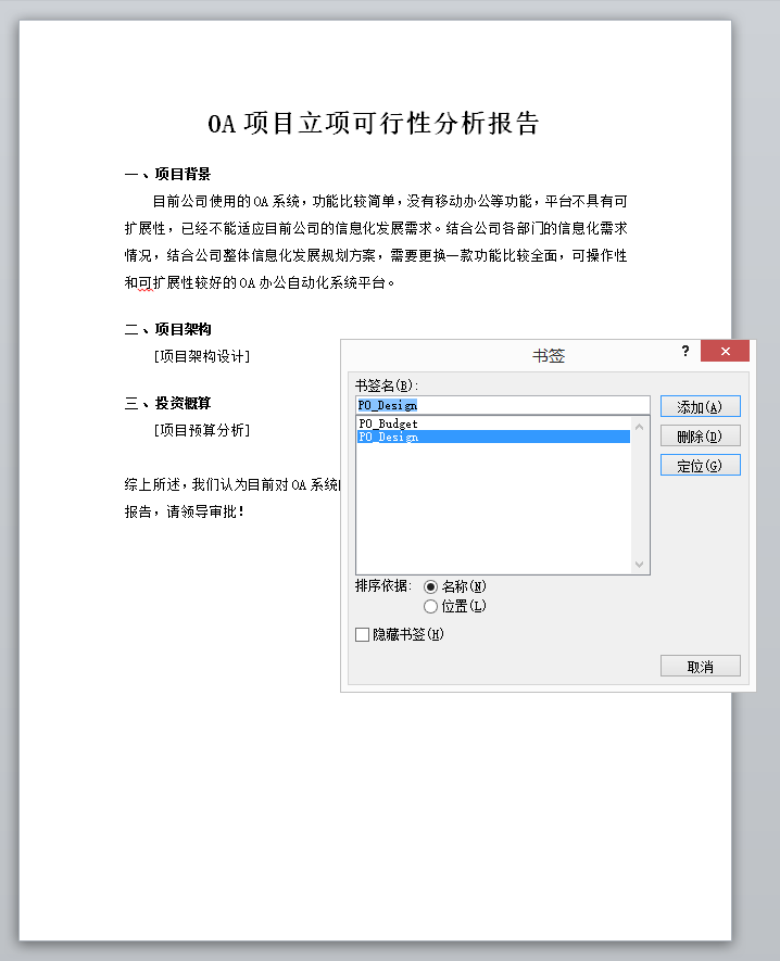 本文就以“OA项目立项可行性分析报告”为例,说明一下PageOffice是如何使用Word合并功能实现生成可行性报告的。比如某员工编辑了可行性报告的主体文件,如下图所示。为了让功能描述更简单明了,文件中只使用了两个数据区域PO_Budget(项目预算分析)和PO_Design(项目架构设计)。