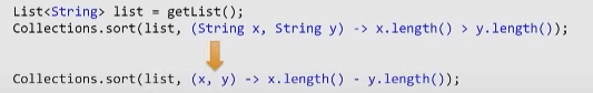 2.jdk8以后编译器类型推断能力更新,对于lambd中变量,能够根据上下文推断类型,丛而省略类型声明,如下图: