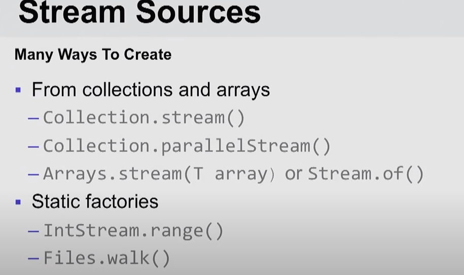 array不是colletion,所以有单独的方法建立stream. Files.walk()相当于遍历文件操作,bufferdinputstreamreader.relines()也可以产生stream