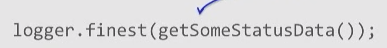 下图是两种执行log输出方法的方式,方法1,无论logger对象的level属性是哪个等级,该getsomestatusdata都会执行。而方法2只有在logger level在finest之下时才会获取数据