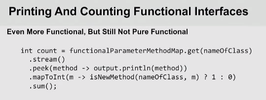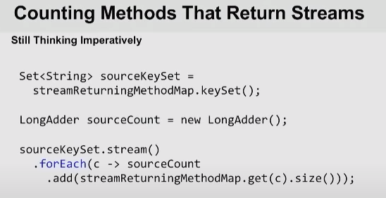 下图为打印每个元素,并统计集合中符合条件的元素个数的范例。这里面有两个teminal操作,一个打印,一个sum。peek适合这种:
