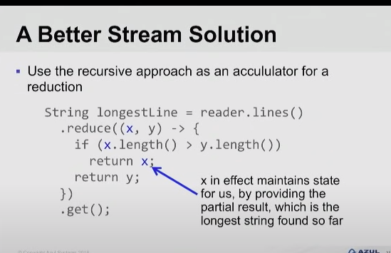 9. stream的reduce战略,和lambda的递归操作,下图的任务是找出file中最长的一行。X代表每次操作的result,y代表下一个元素。