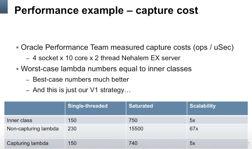 2)每个lambda表达式成本---------capture cost, 对于有变化的X以外的变量,每变一次,要调用一次constructor,因为这个变量是innerclass的一个私有属性,用constructor给它赋值。生成instance,然后专心处理X变量。
