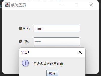 JOptionPane.showMessageDialog(null, "用户名或密码不正确");