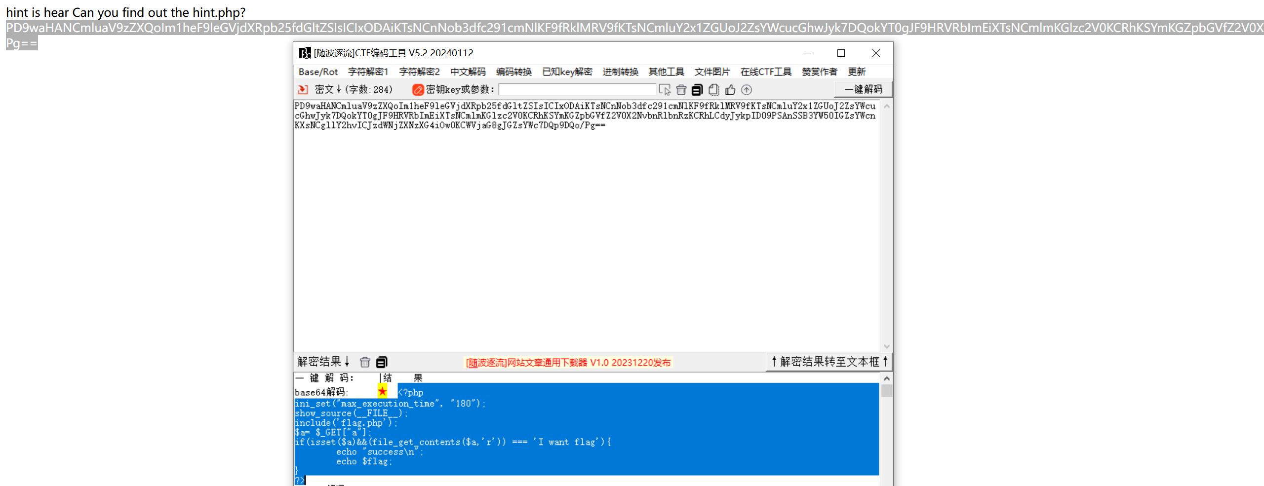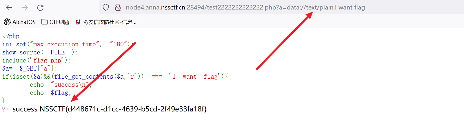 (file_get_contents($a, 'r')) 是一个函数调用,它尝试以读取模式打开 $a 参数指定的文件,并返回文件的内容。 === 'I want flag' 是一个比较操作符,用于比较 file_get_contents($a, 'r') 的结果与字符串 "I want flag" 是否完全相等。如果相等,则条件成立。 因此,整个条件语句的意思是:如果变量 $a 存在且不为 null,并且通过读取文件路径 $a 所得到的文件内容与字符串 "I want flag" 完全相等,那么执行条件下的代码块,输出 "success" 和变量 $flag 的值。