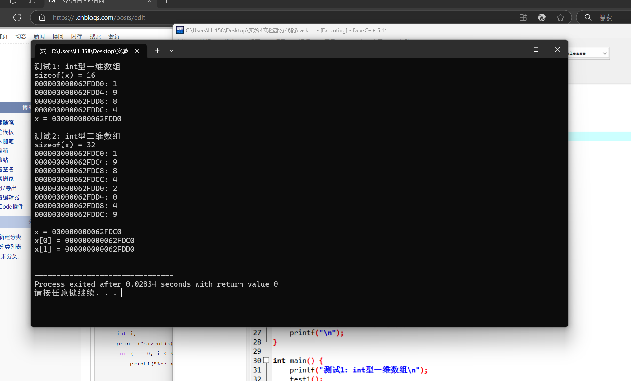 #include <stdio.h> #define N 4 #define M 2 void test1() { int x[N] = {1, 9, 8, 4}; int i; printf("sizeof(x) = %d\n", sizeof(x)); for (i = 0; i < N; ++i) printf("%p: %d\n", &x[i], x[i]); printf("x = %p\n", x); } void test2() { int x[M][N] = {{1, 9, 8, 4}, {2, 0, 4, 9}}; int i, j; printf("sizeof(x) = %d\n", sizeof(x)); for (i = 0; i < M; ++i) for (j = 0; j < N; ++j) printf("%p: %d\n", &x[i][j], x[i][j]); printf("\n"); printf("x = %p\n", x); printf("x[0] = %p\n", x[0]); printf("x[1] = %p\n", x[1]); printf("\n"); } int main() { printf("测试1: int型一维数组\n"); test1(); printf("\n测试2: int型二维数组\n"); test2(); return 0; }
