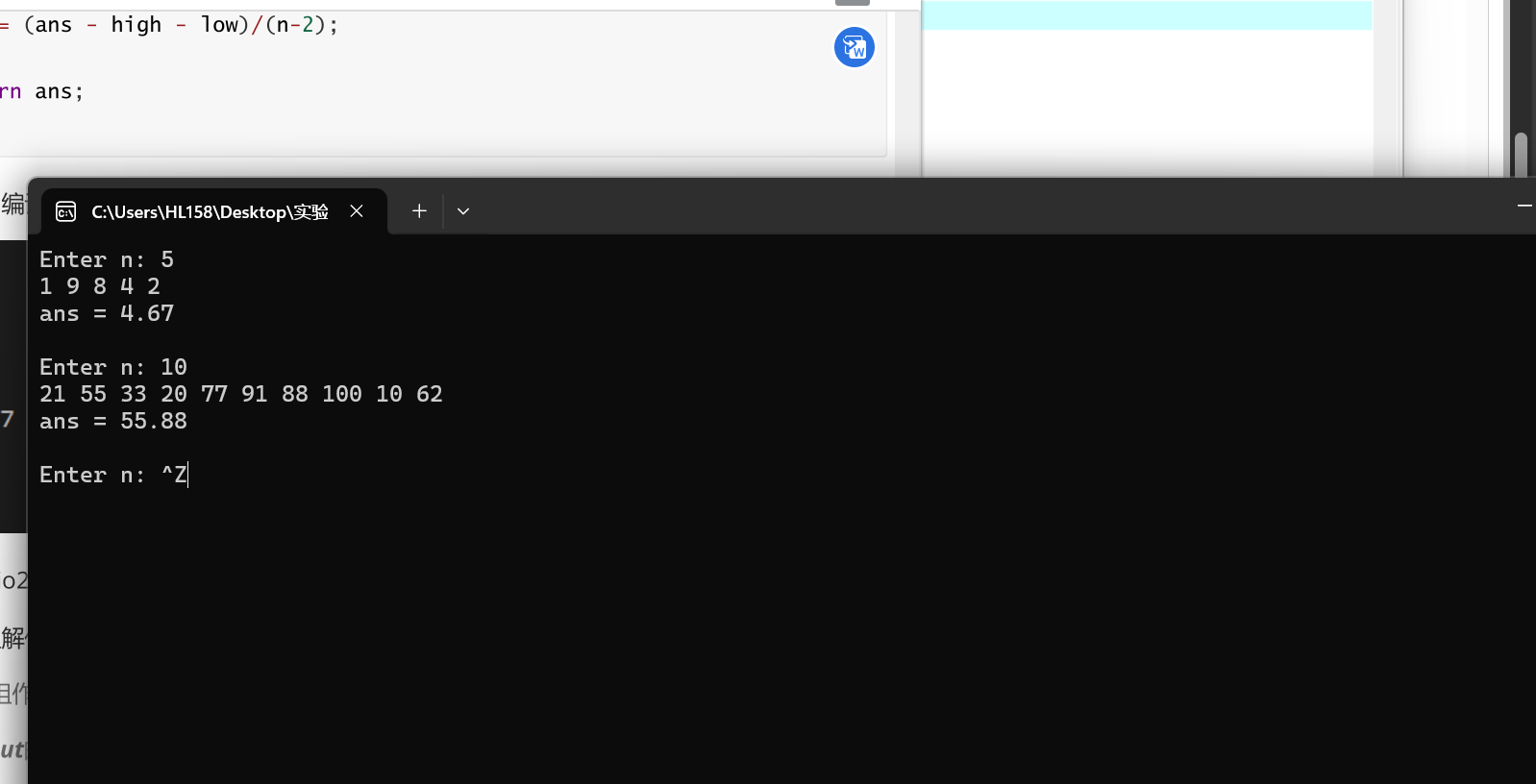 #include <stdio.h> #define N 100 void input(int x[], int n); double compute(int x[], int n); int main() { int x[N]; int n, i; double ans; while(printf("Enter n: "), scanf("%d", &n) != EOF) { input(x, n); ans = compute(x, n); printf("ans = %.2f\n\n", ans); } return 0; } void input(int x[], int n) { int i; for(i = 0; i < n; ++i) scanf("%d", &x[i]); } double compute(int x[], int n) { int i, high, low; double ans; high = low = x[0]; ans = 0; for(i = 0; i < n; ++i) { ans += x[i]; if(x[i] > high) high = x[i]; else if(x[i] < low) low = x[i]; } ans = (ans - high - low)/(n-2); return ans; }