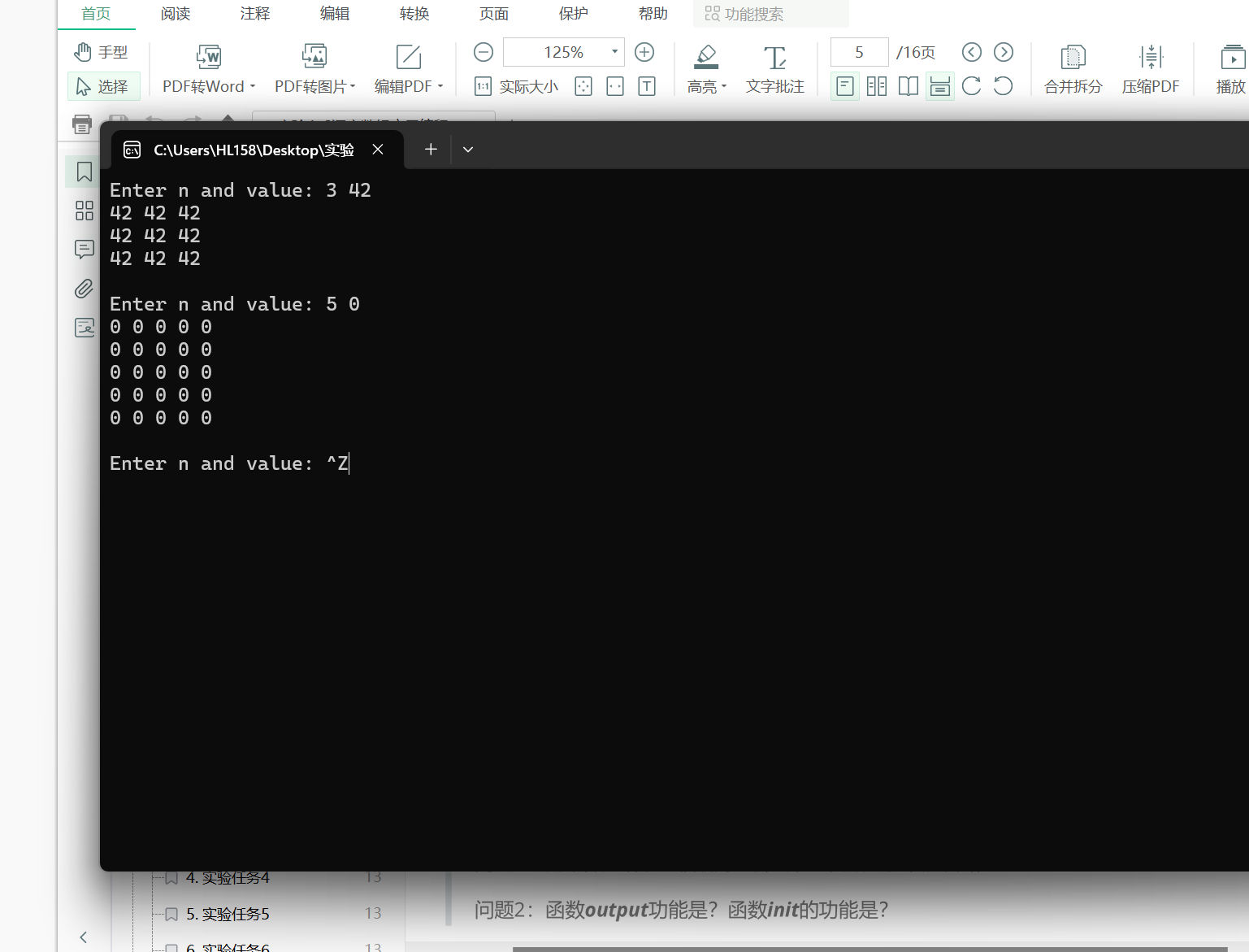 问题2 output的功能是控制数组的行和列,使其为一个行和列相同都是n的方阵 同时输出二维数组各个元素的值