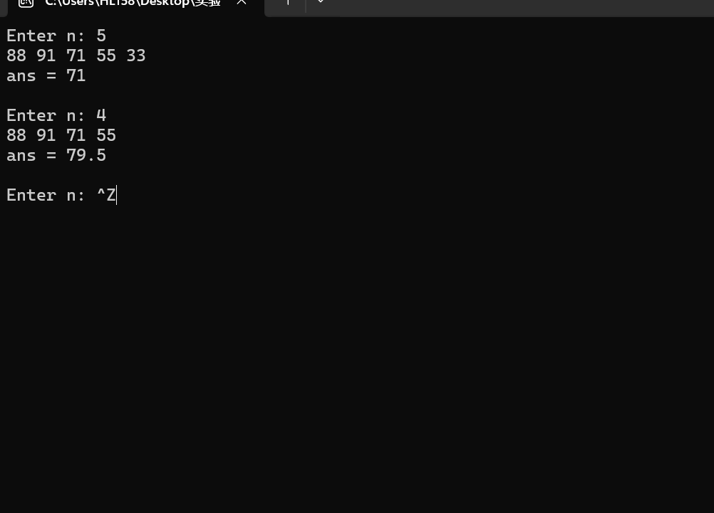 #include <stdio.h> #define N 100 double ans; double median(int x[N],int n); void input(int x[N],int n); int main() { int x[N]; int n; double ans; while(printf("Enter n: "), scanf("%d", &n) != EOF) { input(x, n); ans = median(x, n); printf("ans = %g\n\n", ans); } return 0; } void input(int x[N],int n){ int i; for(i=0;i<n;++i) scanf("%d",&x[i]); } double median(int x[N],int n){ double ans; int i,j,temp; for (i = 0; i < n - 1; i++) { for (j = 0; j < n - i - 1; j++) { if (x[j] > x[j + 1]) { int temp = x[j]; x[j] = x[j + 1]; x[j + 1] = temp; } } } if(n%2==0) ans=(x[n/2]+x[n/2-1])/2.0; if(n%2==1) ans=x[(n+1)/2-1]; return ans; }