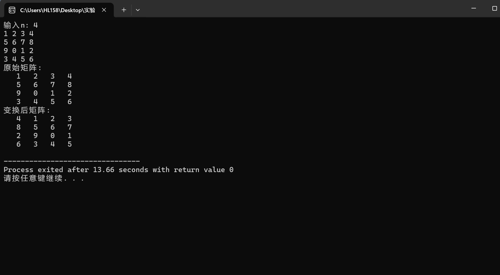 #include <stdio.h> #define N 100 // 函数声明 void input(int x[][N], int n); void output(int x[][N], int n); void rotate_to_right(int x[][N],int n); int main() { int x[N][N]; int n; printf("输入n: "); scanf("%d", &n); input(x, n); printf("原始矩阵:\n"); output(x, n); rotate_to_right(x,n); printf("变换后矩阵:\n"); output(x, n); return 0; } // 函数定义 // 功能: 输入一个n*n的矩阵x void input(int x[][N], int n) { int i, j; for (i = 0; i < n; ++i) { for (j = 0; j < n; ++j) scanf("%d", &x[i][j]); } } // 函数定义 // 功能: 输出一个n*n的矩阵x void output(int x[][N], int n) { int i, j; for (i = 0; i < n; ++i) { for (j = 0; j < n; ++j) printf("%4d", x[i][j]); printf("\n"); } } void rotate_to_right(int x[][N],int n){ int k[N]; int j,i; for (i = 0; i < n; ++i) { k[i]=x[i][n-1]; } for (j = n-1; j > 0; --j) { for (i = 0; i < n; ++i) { x[i][j] = x[i][j-1]; } } for (i = 0; i < n; ++i) { x[i][0]=k[i]; } }
