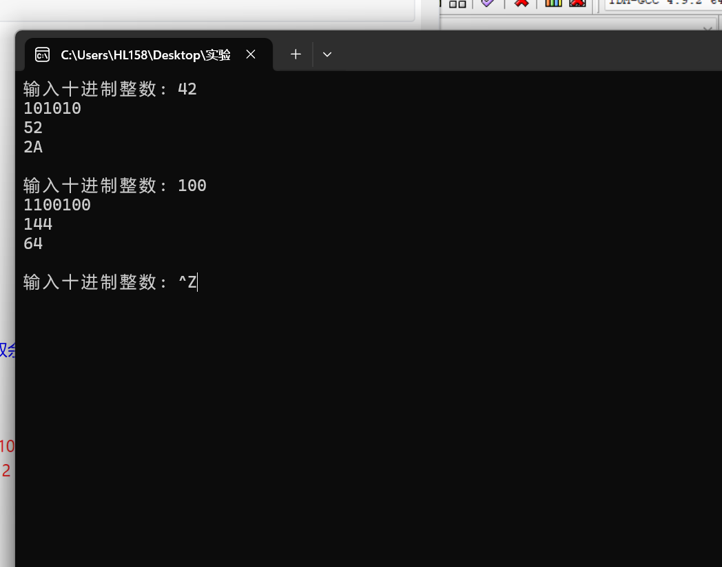 #include <stdio.h> #define N 100 void dec_to_n(int x, int n); // 函数声明 int main() { int x; while(printf("输入十进制整数: "), scanf("%d", &x) != EOF) { dec_to_n(x, 2); // 函数调用: 把x转换成二进制输出 dec_to_n(x, 8); // 函数调用: 把x转换成八进制输出 dec_to_n(x, 16); // 函数调用: 把x转换成十六进制输出 printf("\n"); } return 0; } void dec_to_n(int x, int n){ int a[N]; int i=0,j; while(x!=0){ a[i++]=x%n; x/=n; } for(j=i-1;j>=0;--J){ if(a[j]<10){ printf("%d",a[j]); } else{ printf("%c",a[j]-10+'A'); } } printf("\n"); }