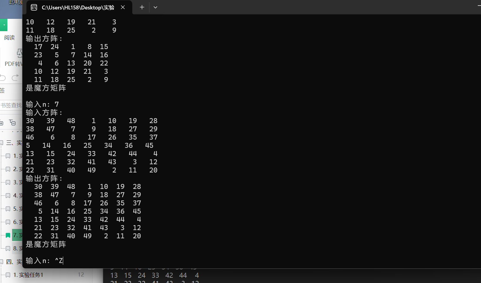 #include <stdio.h> #define N 100 // 函数声明 void input(int x[][N], int n); void output(int x[][N], int n); int is_magic(int x[][N],int n); int main() { int x[N][N]; int n; while(printf("输入n: "), scanf("%d", &n) != EOF) { printf("输入方阵:\n"); input(x, n); printf("输出方阵:\n"); output(x, n); if(is_magic(x, n)) printf("是魔方矩阵\n\n"); else printf("不是魔方矩阵\n\n"); } return 0; } // 函数定义 // 功能: 输入一个n*n的矩阵x void input(int x[][N], int n) { int i, j; for (i = 0; i < n; ++i) { for (j = 0; j < n; ++j) scanf("%d", &x[i][j]); } } // 功能: 输出一个n*n的矩阵x void output(int x[][N], int n) { int i, j; for (i = 0; i < n; ++i) { for (j = 0; j < n; ++j) printf("%4d", x[i][j]); printf("\n"); } } int is_magic(int x[][N],int n){ int i,j,a,b=0; a=(1+n*n)*(n*n)/2/n; for(i=0;i<n;i++){ b=0; for(j=0;j<n;j++){ b+=x[i][j]; } if(b!=a){ return 0; } } for(i=0;i<n;i++){ b=0; for(j=0;j<n;j++){ b+=x[j][i]; } if(b!=a){ return 0; } } b=0; for(i=0;i<n;i++){ b+=x[i][i]; } if(b!=a){ return 0; } b=0; for(i=0;i<n;i++){ b+=x[i][n-1-i]; } if(b!=a){ return 0; } return 1; }