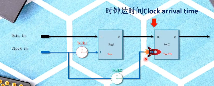 芯片上有专用的时钟管脚, 到达reg1的延时脚tclk1 到reg2 tclk2 延时