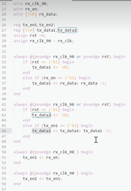 我们把输入的数据,rx的数据累加再减一,就是一个组合逻辑的操作 然后tx_data1又做了一个累加,计算的操作赋值给了tx。这样中间就增加了两级寄存器。