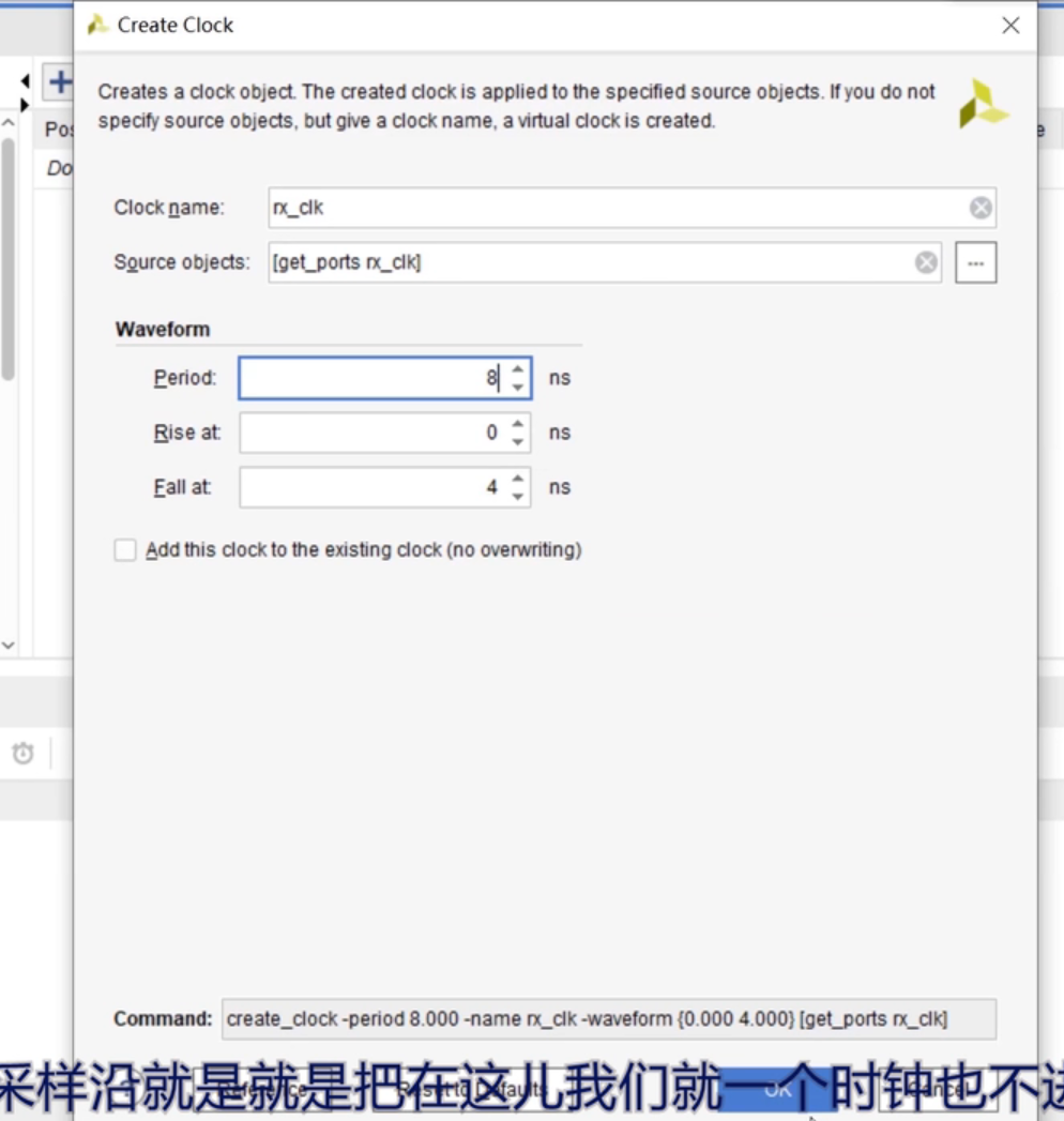 意思是生成一个creat clock 周期是8NS,名称是RX_CLK 波形是上升沿是0,下降沿是4,然后查找到管脚使用