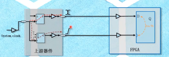 数据由上游的芯片产生数据,而时钟是由芯片外部,由PCB板上的晶振或时钟源所产生的时钟既给了上游的芯片,又给了下游的芯片