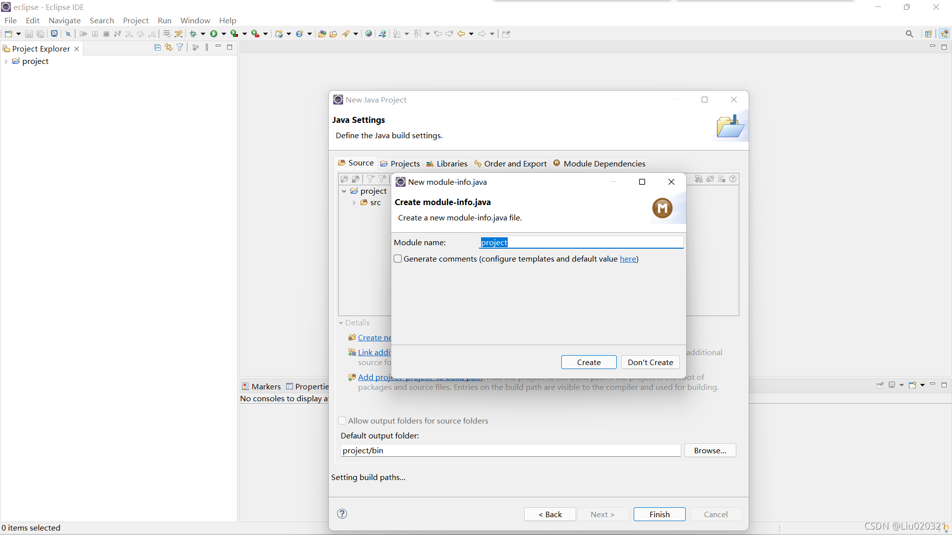 4. 点击next-finish,出现如下界面后点击don't creat
