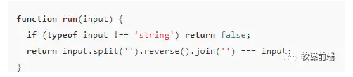 先用split将字符串分割成数组,之后用reverse将数组中元素的顺序颠倒过来,最用用join再将数组拼接成字符串,判断与输入值是否相等,相等则为回文。