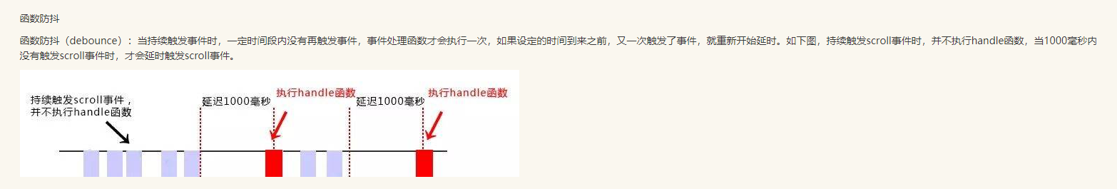 函数防抖:将几次操作合并为一此操作进行。原理是维护一个计时器,规定在delay时间后触发函数,但是在delay时间内再次触发的话,就会取消之前的计时器而重新设置。这样一来,只有最后一次操作能被触发。