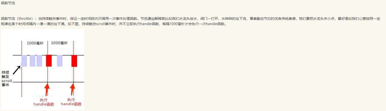 函数节流:使得一定时间内只触发一次函数。原理是通过判断是否到达一定时间来触发函数。