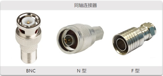 同轴电缆使用许多不同类型的连接器。图中显示了卡口式Neill–Concelman (BNC)、N 型和 F 型连接器。