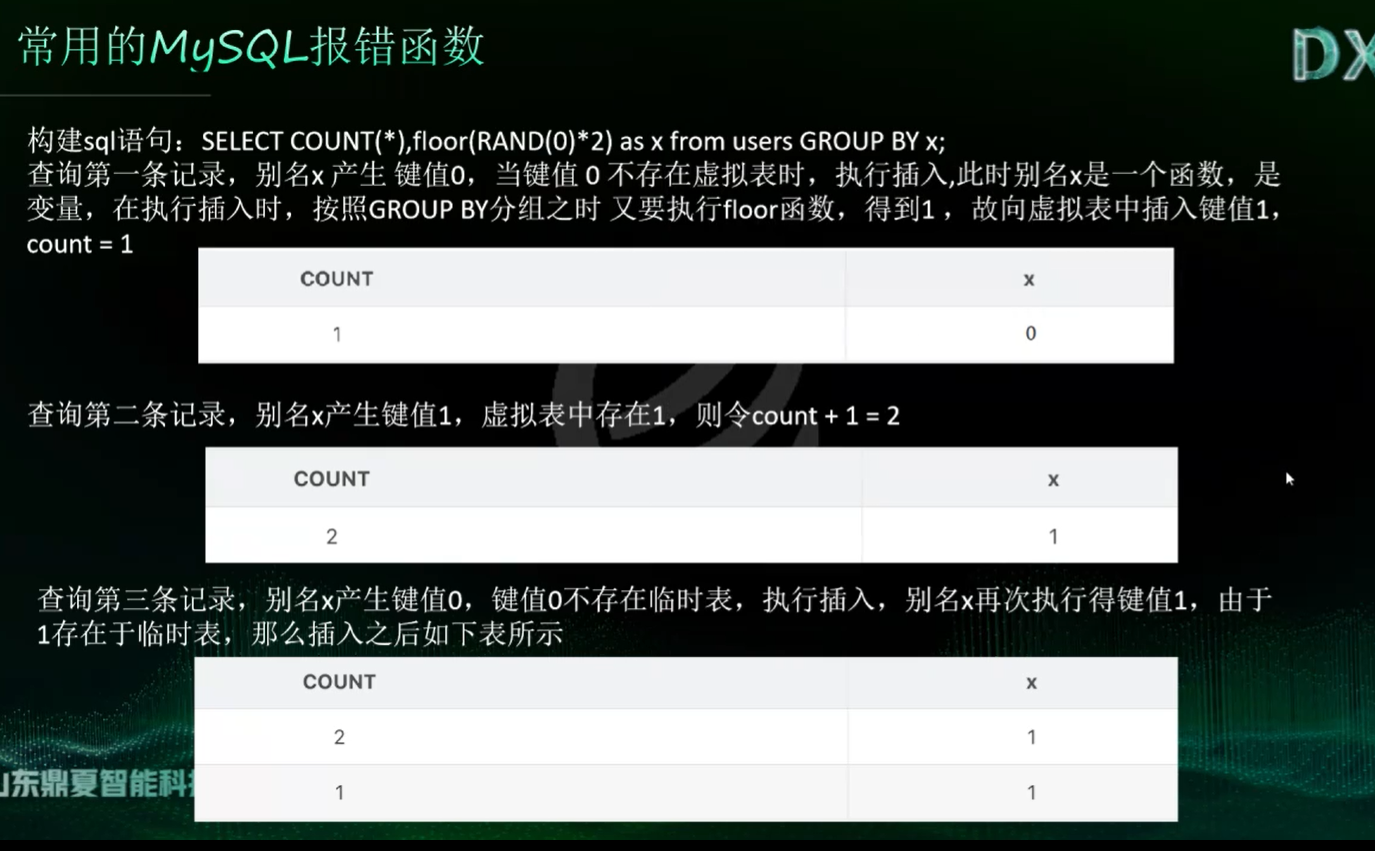 所以这里确定了,rand0的前三个数就是这三个,所以这里*2之后,可以出现第一个取整是0,第二个是1,第三个是1,而select后面可以跟着数学函数,查询第一条记录的时候,rand0产生了0.15那个数,乘以2取整是0,插入这个虚表,并且count为1,第二次查询的时候,产生的是0.6几,乘以2取整是1,第一次出现,插入这个表,count是1,必须得有大于等于三行的数据才能行,因为这样才能产生冗余,这里搞懂了,首先明白groupby函数的运行顺序,第一次是查询,第二次是插入,都会运行一次x,第一次运行x得到0,因为虚拟表里没有x=0的,所以插入,但是插入的时候,x又运行了一次,floor之后为1,这个类似于跟地址一样,是存在于那个地址的数变化了,所以表内的内容也变成了1,之后是读取表的第二行数据,然后rand运行第三次,得到0.63那个,floor之后是1,因为1已经在表内了,所以,直接count++,之后是第四行数据,得到的是0.33,然后floor之后是0,0不在虚拟表内,所以插入,插入的时候再次运行函数得到1,然后0变成了1和之前那个1冲突了。