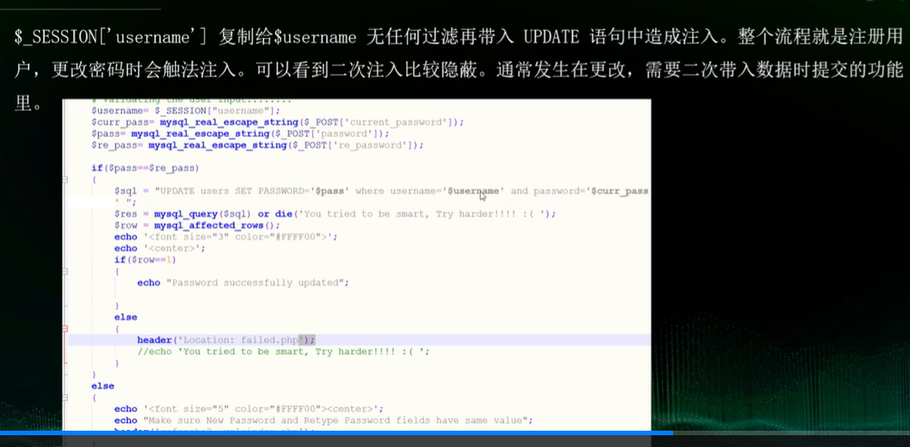 第一次插入的时候,所有的特殊字符都被/给转义了,但是/不会 存入数据库,已经存入数据库的还是之前的恶意数据本身,并且此时因为已经存入数据库,会认为这个是可信的,不会再被转义,此时就可以进行注入