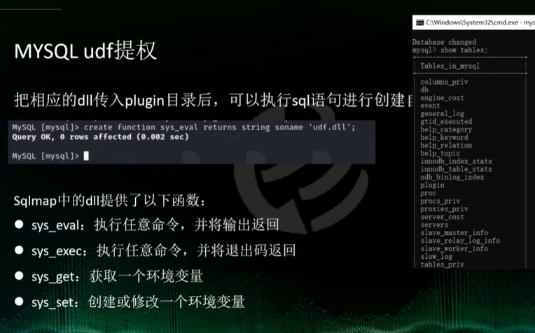 如果想要借鉴dll的话,可以去sqlmap里的去看,如果dll文件比较大,可以转换成十六进制,然后再上传,上传之后,执行sql语句进行创建自定义函数,sqlmap里的dll提供了以下函数
