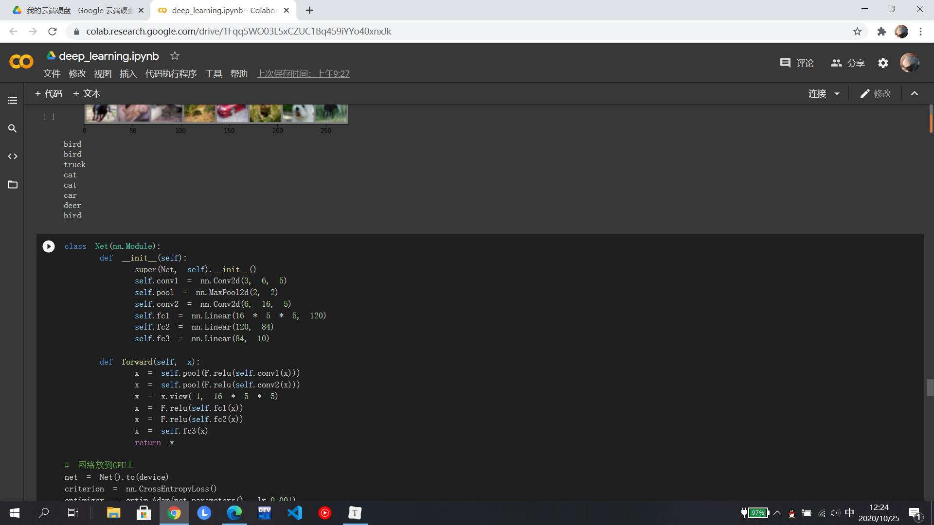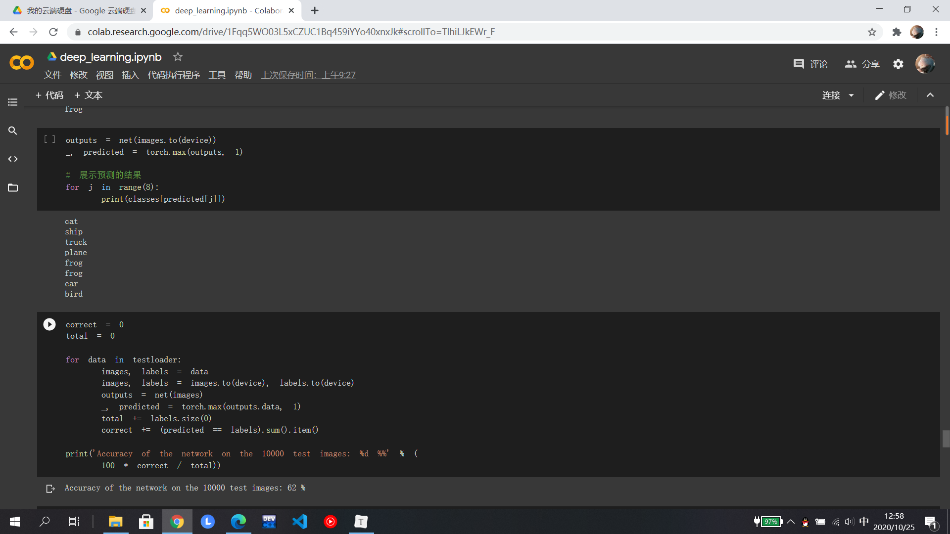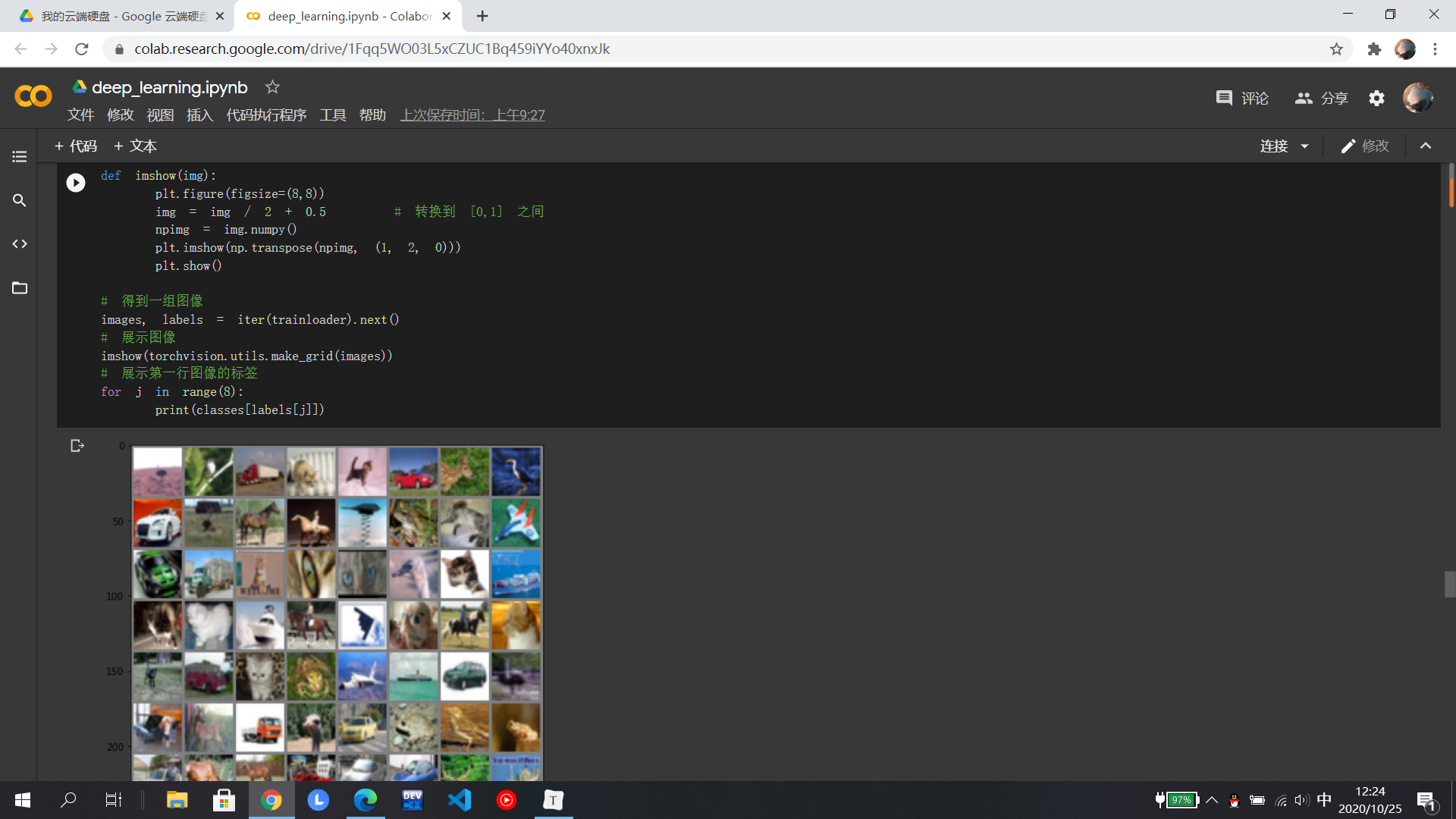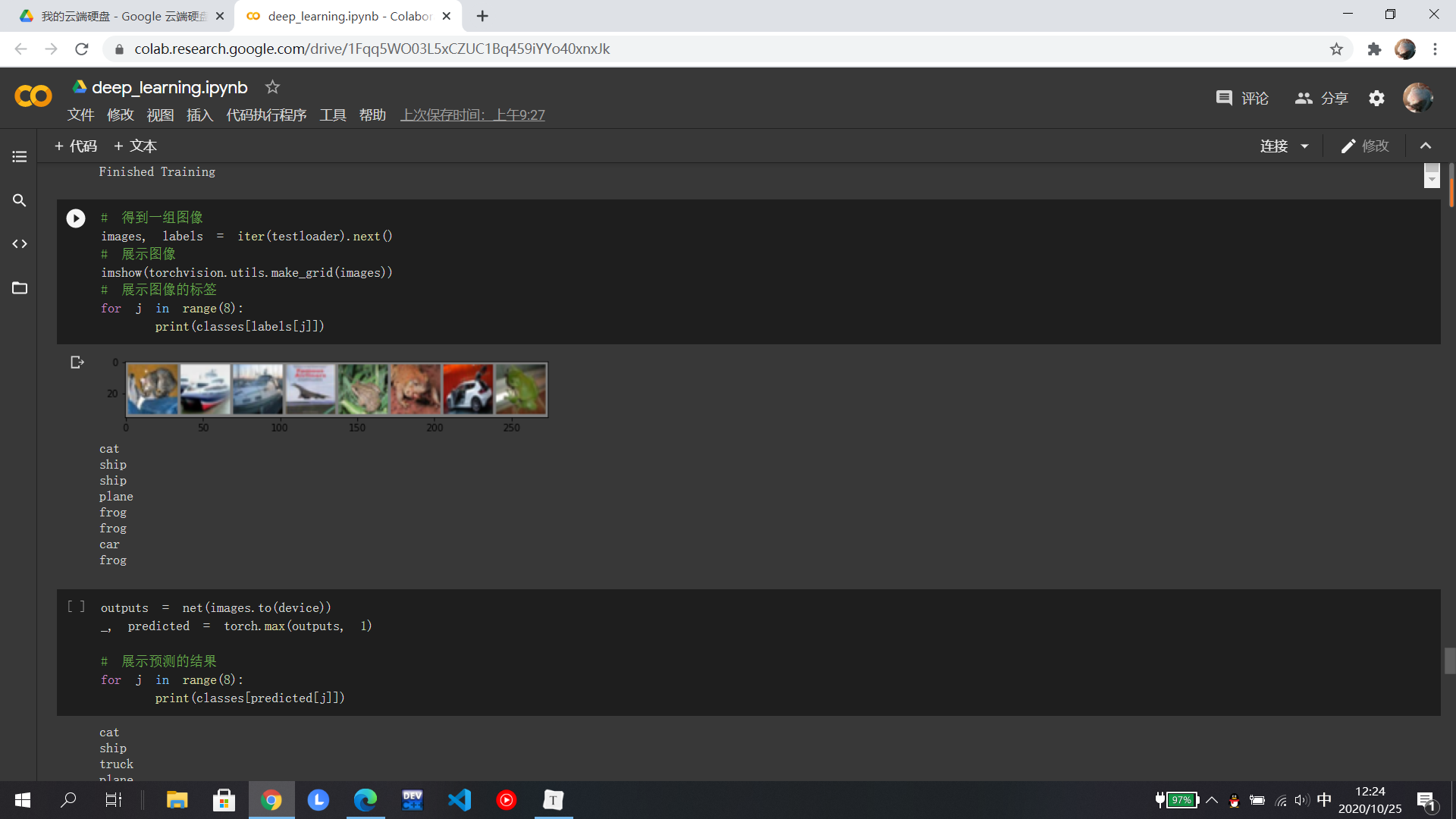 在MNIST数据集分类中,分别在小型全连接网络和卷积神经网络中训练,知道相比之下卷积神经网络的正确率更高,打乱像素后,全连接的正确率反而更高是因为在全连接网络中参数更多;在CIFAR10数据集分类使用了损失函数,其目的是衡量吻合度,然后进行优化从而提高吻合度;至于使用VGG神经网络可以显著提高准确率,相比于AlexNet,它是一个更深网络。至于具体的代码还有待研究......