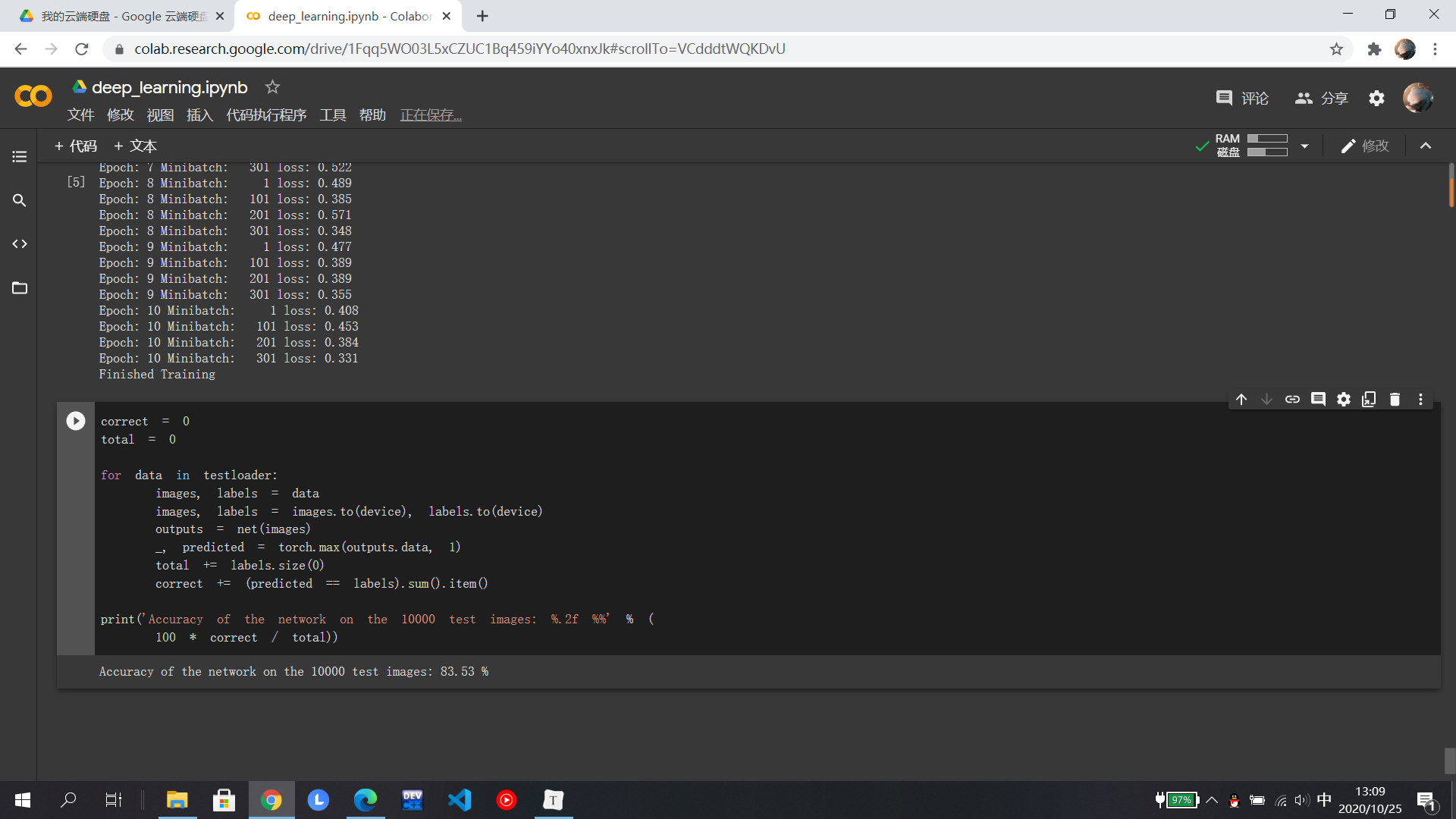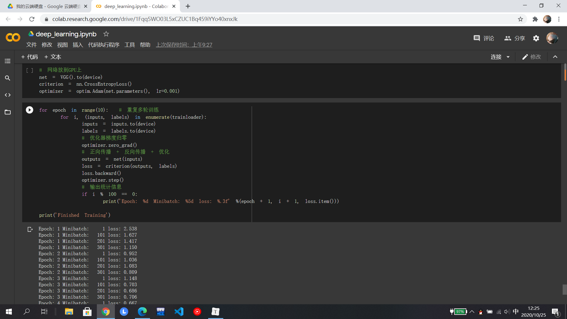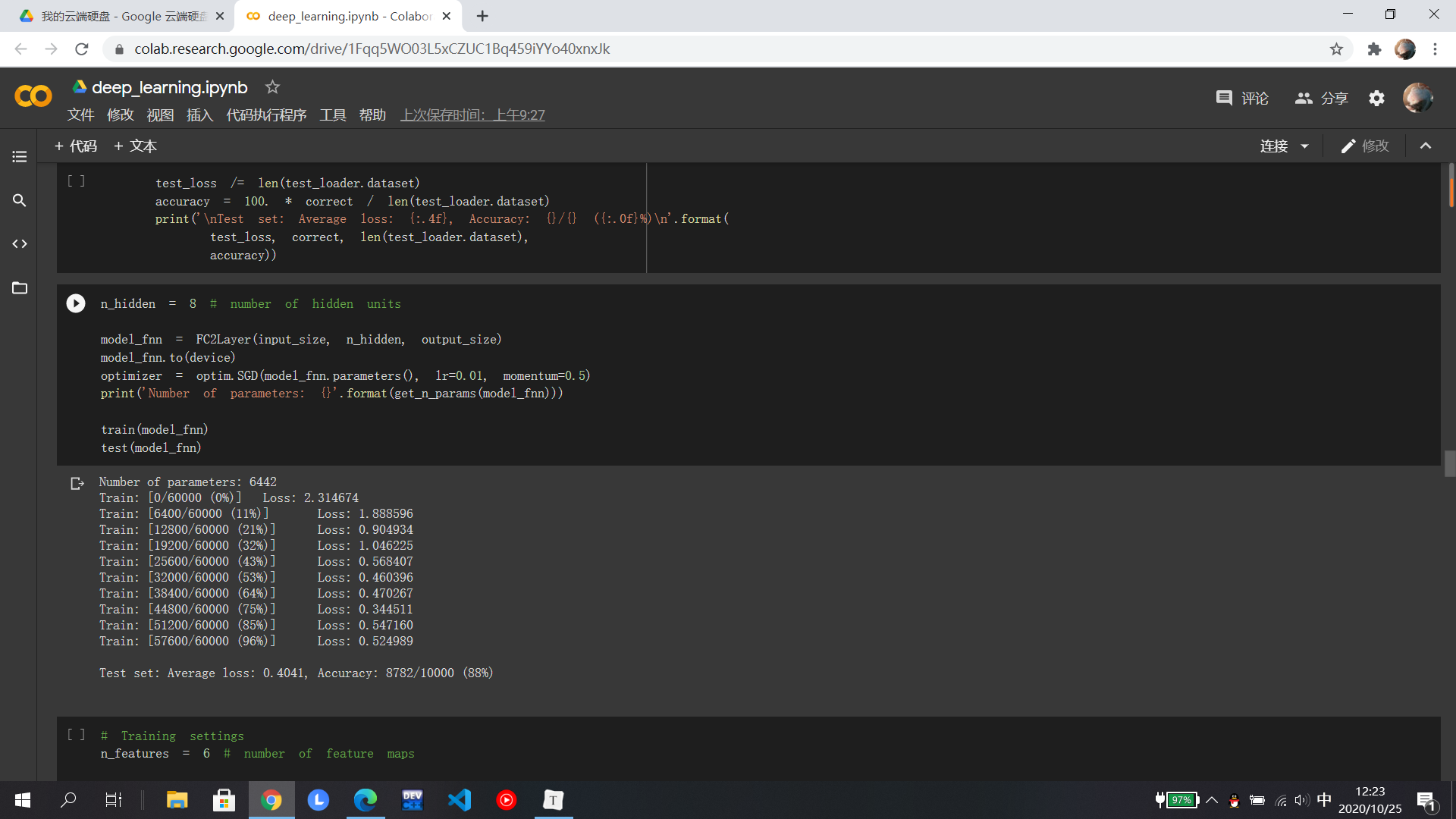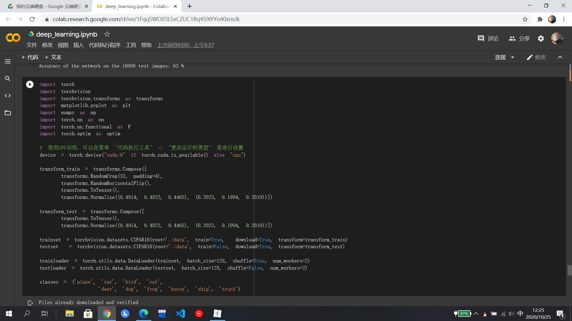 在MNIST数据集分类中,分别在小型全连接网络和卷积神经网络中训练,知道相比之下卷积神经网络的正确率更高,打乱像素后,全连接的正确率反而更高是因为在全连接网络中参数更多;在CIFAR10数据集分类使用了损失函数,其目的是衡量吻合度,然后进行优化从而提高吻合度;至于使用VGG神经网络可以显著提高准确率,相比于AlexNet,它是一个更深网络。至于具体的代码还有待研究......