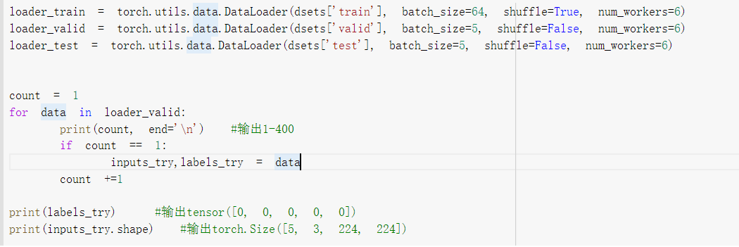 (1)建立loader,分别从对应的目录里读取图片。valid 数据一共有2000张图,每个batch是5张,因此,下面进行遍历一共会输出到 400