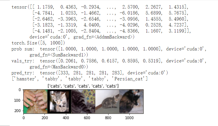 在这部分代码中,对输入的5个图片利用VGG模型进行预测,同时,使用softmax对结果进行处理,随后展示了识别结果。可以看到,识别结果是比较非常准确的。