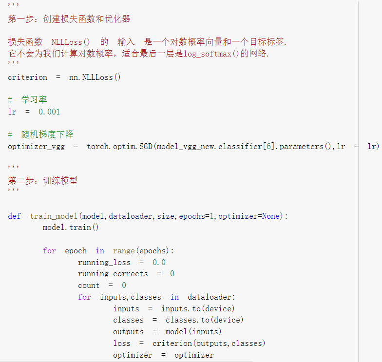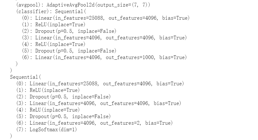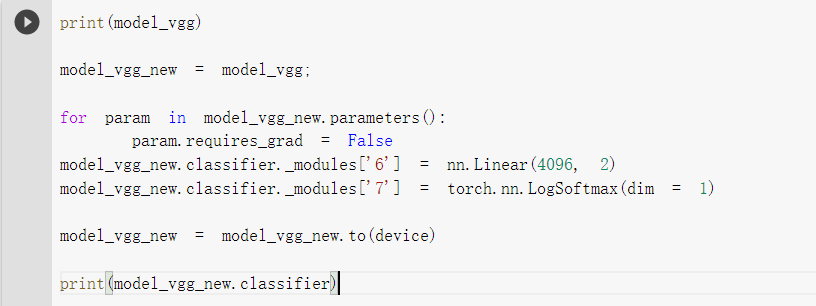 我们的目标是使用预训练好的模型,因此,需要把最后的 nn.Linear 层由1000类,替换为2类。为了在训练中冻结前面层的参数,需要设置required_grad=False。这样,反向传播训练梯度时,前面层的权重就不会自动更新了。训练中,只会更新最后一层的参数。