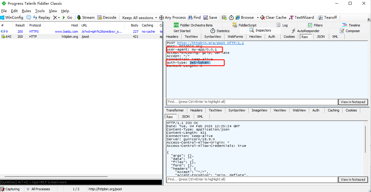 - Inspectors查看请求消息和响应消息,点击Raw查看原始的请求消息和响应消息
