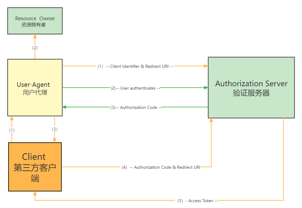 1:User-Agent(用户代理):使用客户端标识加回调用户代理接口的URI,作为参数传给Authorization Server(验证服务器).