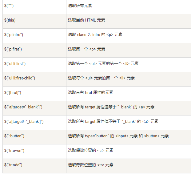 2.选择器:jQuery 选择器允许您对 HTML 元素组或单个元素进行操作,基于元素的 id、类、类型、属性、属性值等"查找"(或选择)HTML 元素。 它基于已经存在的 CSS 选择器,除此之外,它还有一些自定义的选择器。