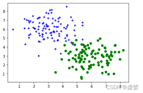 1 import tensorflow as tf 2 import matplotlib.pyplot as plt 3 4 from matplotlib import animation, rc 5 from IPython.display import HTML 6 import matplotlib.cm as cm 7 import numpy as np 8 %matplotlib inline 9 10 dot_num = 100 11 x_p = np.random.normal(3., 1, dot_num) 12 y_p = np.random.normal(6., 1, dot_num) 13 y = np.ones(dot_num) 14 C1 = np.array([x_p, y_p, y]).T 15 16 x_n = np.random.normal(6., 1, dot_num) 17 y_n = np.random.normal(3., 1, dot_num) 18 y = np.zeros(dot_num) 19 C2 = np.array([x_n, y_n, y]).T 20 21 plt.scatter(C1[:, 0], C1[:, 1], c='b', marker='+') 22 plt.scatter(C2[:, 0], C2[:, 1], c='g', marker='o') 23 24 data_set = np.concatenate((C1, C2), axis=0) 25 np.random.shuffle(data_set)